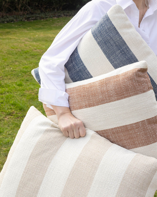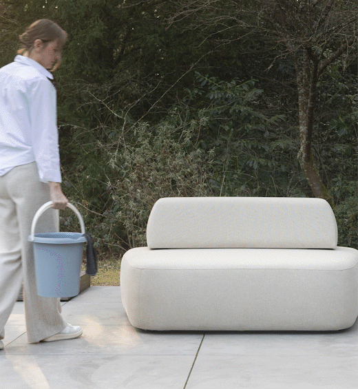Our outdoor sofas can stay outside all year round. The fabric is resistant to oil, dirt, and mold and can be easily cleaned with water and soap.