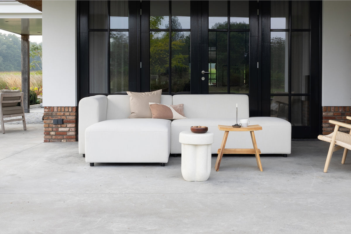 The frame of outdoor sofa Sol is made of 100% aluminium. This means the sofa is not only lighter in weight, but also completely stainless and weatherproof. The under springing is made with nosag springs, just like in our high-quality indoor sofas, combined with recycled foam. Is your terrace not quite flat? No problem, with the variable legs you will always sit straight.